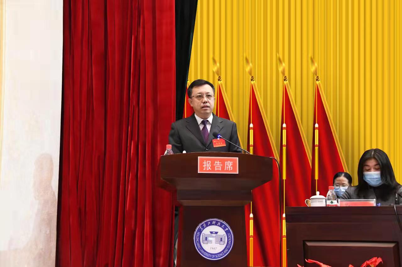 校党委书记周宏力同志代表中国共产党黑龙江科技大学第一届委员会向大会作了题为《凝心聚力谋发展 踔厉奋发谱新篇 为建成矿业特色鲜明的高水平应用型大学而努力奋斗》的报告。